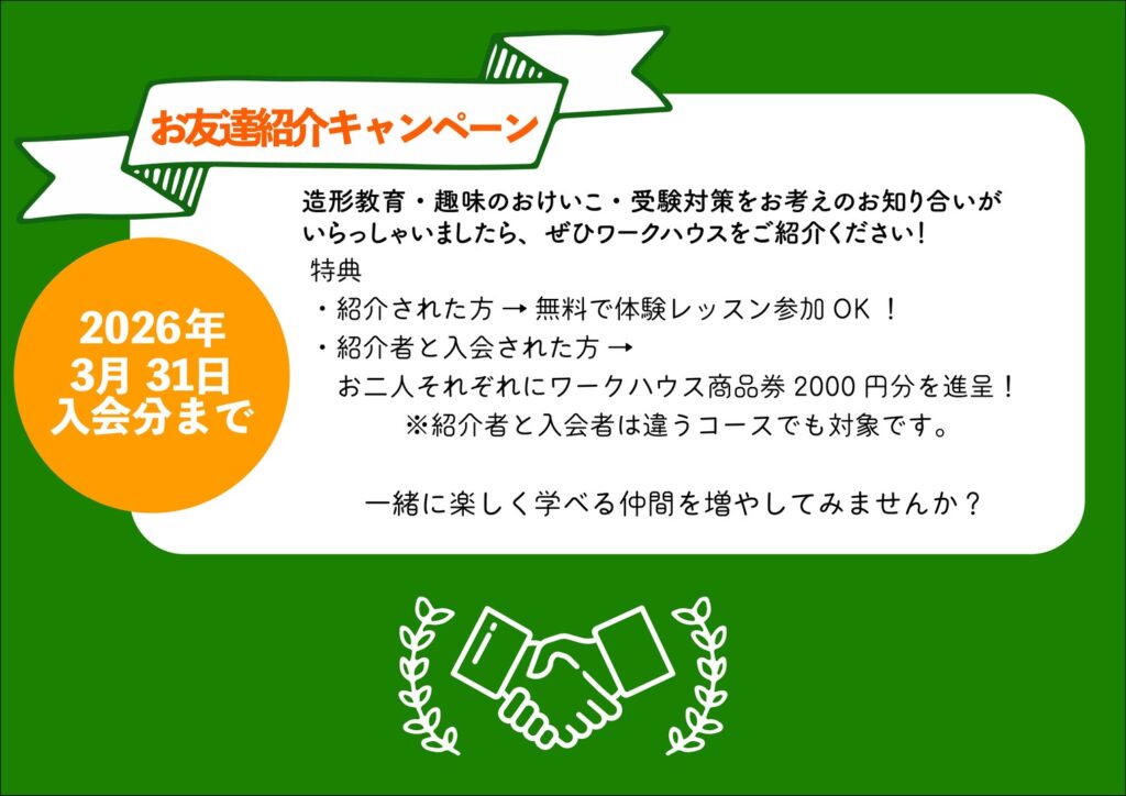 造形教育・趣味のおけいこ・受験対策をお考えのお知り合いをご紹介ください。以下の特典をご用意しています。